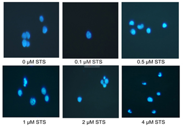 操作流程:使用不同濃度星飽菌素(Staurosporine,STS)凋亡處理Jurkat細(xì)胞。調(diào)整細(xì)胞密度為1×106/ml,每孔2 ml接種于六孔板中;加入終濃度為0,0.1,0.5,1,2,4 μM STS,37℃ 5%CO2培養(yǎng)3小時;500 g 3 min收集細(xì)胞;細(xì)胞沉淀中加入1 ml固定液,常溫固定10 min;1×PBS漂洗兩次;細(xì)胞沉淀中加入0.5 ml Hoechst 33258染色液,37℃避光染色10 min;離心后細(xì)胞沉淀重懸于100 μl 1×PBS中;取5 μl細(xì)胞懸液滴于載玻片上,加5 μl 抗熒光淬滅劑,封片觀察。