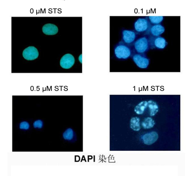 ml接種于六孔板中;加入終濃度為0,0.1,0.5,1 μM STS,37℃ 5%CO2培養(yǎng)3小時;500 g 3 min收集細胞;細胞沉淀中加入1 ml固定液,常溫固定10 min;1×PBS漂洗兩次;細胞沉淀中加入0.5 ml DAPI染色液,37℃避光染色10 min;離心后細胞沉淀重懸于100 μl 1×PBS中;取5 μl細胞懸液滴于載玻片上,加5 μl 抗熒光淬滅劑,封片觀察。