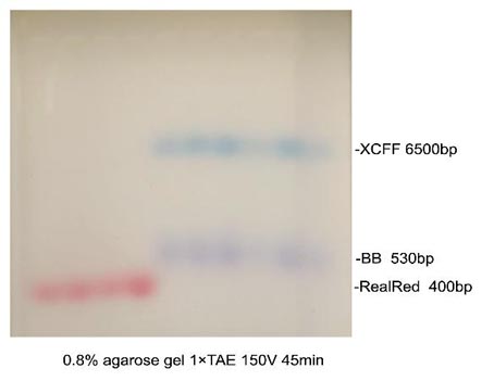 6×RealRed  DNA上樣緩沖液(6×RealRed DNA loading buffer)是一種經過改良的六倍濃縮的DNA上樣緩沖液。常規的以溴酚藍為指示劑的DNA緩沖液,由于溴酚藍的電泳的位置與200-500 bp的DNA的電泳位置相近,在EB染色觀察200-500bpDNA時,溴酚藍對這些DNA片段的觀察有很強的干擾。特別是當這些小片段的量較少時,溴酚藍甚至會把小片段DNA的信號全部遮蓋掉。而該上樣緩沖液紅色指示前沿的電泳位置相當于100-200 bp的DNA片段。這樣就可以基本消除染料對小片段DNA觀察時的干擾。另外,6×RealRed