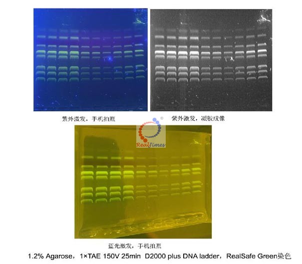 2.1 用1×TAE或0.5×TBE將染料稀釋制成1X染色溶液。(例如:將10 μl RealSafe Green加入到100 ml 1×TAE或0.5×TBE中)。如使用RealSafe Green in TAE buffer(貨號:GS002)或RealSafe Green in TBE buffer(貨號:GS003),直接取適量體積的緩沖液直接使用。