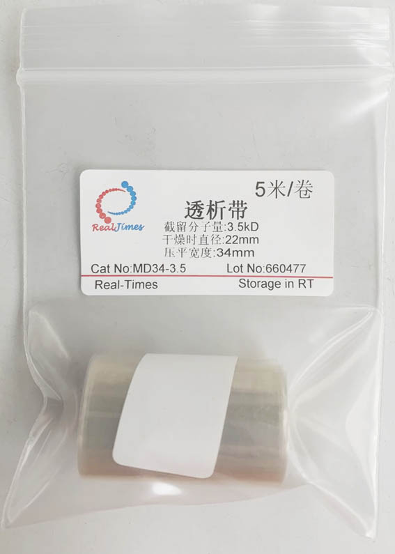 透析膜可用動物膜和玻璃紙等,但用的最多的還是用纖維素制成的透析膜,目前常用的是美國Union Carbide (聯合碳化物公司)和美國光譜醫學公司生產的各種尺寸的透析管,截留分子量MWCO(即留在透析袋內的生物大分子的最小分子量)。截留分子量越大也就是說透過性越大。