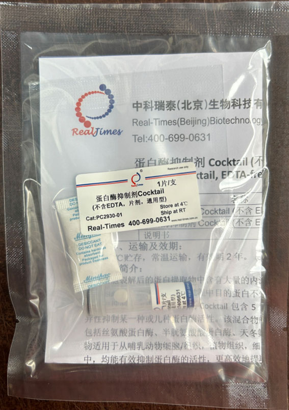 細胞裂解后的蛋白提取物中含有大量的內源性蛋白酶,這些酶可以降解細胞提取物中的蛋白,因此為了防止蛋白純化過程中目的蛋白不受蛋白酶的破壞,需要加入蛋白酶抑制劑對其進行活性抑制。本蛋白酶抑制劑Cocktail包含5種獨立的廣譜蛋白酶抑制劑,每一種抑制劑可特異性抑制某一種或幾種蛋白酶活性。該混合物的優化組合使其可以抑制幾乎所有蛋白酶活性,包括絲氨酸蛋白酶、半胱氨酸酸蛋白酶、天冬氨酸蛋白酶、丙氨酰-氨基肽酶等。此抑制劑混合物適用于從哺乳動物細胞/組織,植物組織,細菌,酵母,真菌中提取蛋白,加入到蛋白裂解液中,均能有效抑制蛋白酶的活性,更高效地提取目的蛋白。廣泛適用于Western Blot和免疫共沉淀等。本品不含有EDTA,不影響金屬依賴蛋白的活性,與金屬螯和層析兼容。