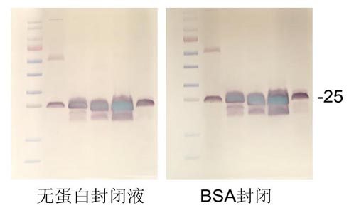 注意:使用本產(chǎn)品,PVDF膜和NC膜使用推薦封閉時(shí)間,經(jīng)多種抗體的測試封閉效果顯著優(yōu)于常規(guī)的BSA封閉1 h。對于一些背景非常高的抗體,可以嘗試延長封閉時(shí)間。如有特殊需要,也可4℃封閉過夜。