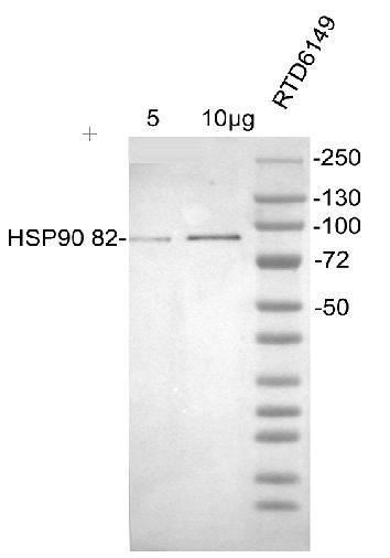 熱激蛋白(Heat Shock Proteins ,HSPs)是生物體在高于正常生長溫度刺激或高鹽、干旱等脅迫條件下誘導合成的應激蛋白,1962年首次在果蠅中發現。按分子量可分為HSP100、HSP90、HSP70、HSP60及小分子量家族(smHSPs),分子量范圍15-110 kD。HSP90已經在各種物種的細胞中發現,并且在免疫原性及物理特征上都比較相似,具有高度保守性,在細胞中的表達相對穩定,因此它常被用于校正系統的內參。本抗體經常作為各種模式生物如擬南芥,水稻等的內參。