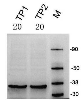 轉膜:NC膜,1×RealBlot快速轉膜液濕轉,穩流400 mA,電壓變化64-57 V,轉膜時間35 min