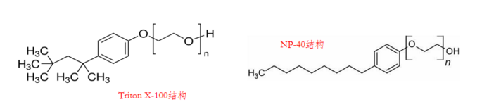 離子型去污劑:非離子型去污劑和離子型不同,它們的頭端基團是沒有極性的親水基團,是比較溫和的表面活性劑。它們可以破壞蛋白質-脂質以及脂質-脂質之間的連接,但是不能破壞蛋白質-蛋白質的連接,而且大多非離子去污劑不能使蛋白質變性。因此,這種去污劑可以使蛋白質溶解和分離,但卻保留了蛋白質的天然構象、功能以及它們的相互作用。如Triton X-100、乙基苯基聚乙二醇(NP-40)、Tween-80等。