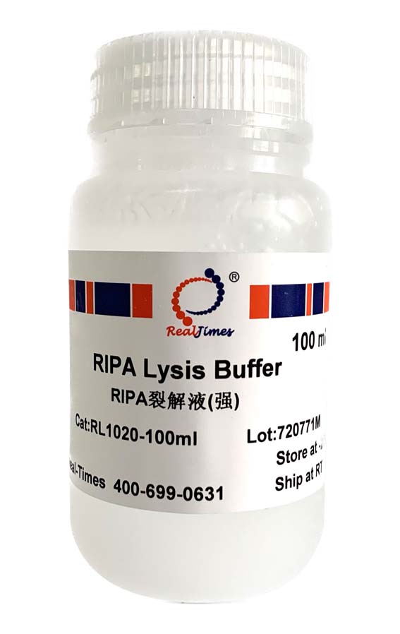 RIPA裂解液(RIPA Lysis Buffer)是一種傳統的細胞組織快速裂解液。RIPA裂解液裂解得到的蛋白樣品可以用于常規的Western、IP等。RIPA的本意是Radio Immunoprecipitation Assay。RIPA裂解液的配方有很多種,根據其裂解液的強度大致可以分為強、中、弱三類。RIPA裂解液(弱)的主要成分為Tris (pH7.4),NaCl,1% NP-40,0.25% sodium deoxycholate,以及sodium orthovanadate,sodium fluoride,EDTA,leupeptin等多種抑制劑,可以有效抑制蛋白降解。用RIPA裂解液裂解得到的蛋白樣品,可以用BCA蛋白濃度測定試劑盒測定蛋白濃度。由于含有較高濃度的去垢劑,不能用Bradford法測定由本裂解液裂解得到樣品的蛋白濃度。