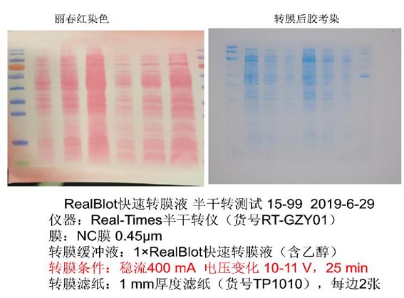 10×RealBlo快速濕轉轉膜液使用獨特配方,能高效快速地將蛋白轉移到印跡膜(PVDF或硝纖膜)上。使用濕轉法(Tank blot)能在15-40分鐘內完成轉膜過程。