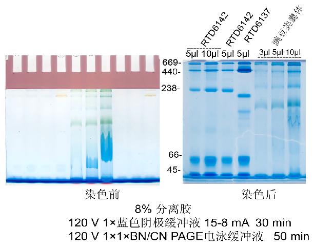 電泳:8% BN手灌膠,穩(wěn)壓200V 1×藍色陰極緩沖液至指示前沿距離膠上沿2/3處,