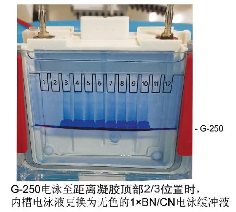 BN-PAGE電泳外槽使用1×BN/CN電泳緩沖液;內(nèi)槽開始電泳使用的是1×藍色陰極緩沖液,冰浴電泳,等待電泳指示前沿到達距離凝膠頂部2/3處時,將電泳緩沖液更換為1×BN/CN電泳緩沖液,繼續(xù)后續(xù)電泳,因為過多染料會影響蛋白在凝膠中的遷移以及蛋白后續(xù)的轉(zhuǎn)膜實驗。