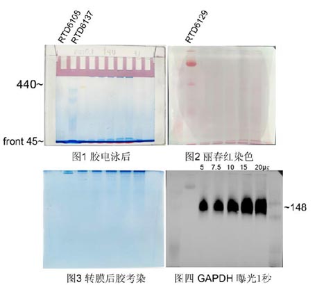 轉(zhuǎn)膜效果檢測:膜用麗春紅染色液染色(貨號:RTD6301)有可見條帶,膠用FastBlue蛋白染色液染色