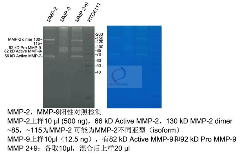 本試劑盒提供明膠酶譜分析的全套試劑,試劑盒可進行50 次標準膠(8×10 cm)檢測,如果小膠加樣孔為10~15個,則總計可檢測500~750 個樣品。試劑盒配套有膠原酶陽性對照,可以有效分解明膠,方便判斷凝膠及電泳體系是否有問題。