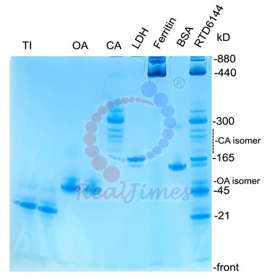2. 該產品不含蛋白凝膠制備試劑,您可以選擇非變性PAGE凝膠制備及電泳試劑盒(貨號:RTD6130)或者蛋白預制膠(貨號RTD6118)。如自備試劑,經典Laemmli系統中把制膠溶液、電泳緩沖液和上樣緩沖液中的SDS和還原劑(DTT或β-巰基乙醇)全部去除即可進行非變性電泳。