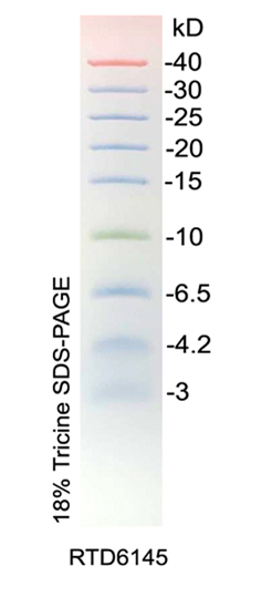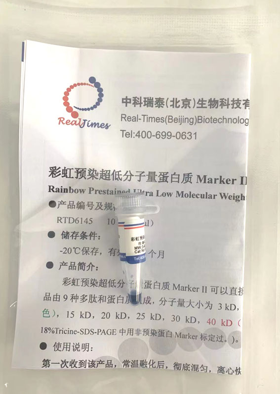 彩虹預染超低分子量蛋白質Marker II可以直接觀察蛋白電泳及清晰判斷Western Blotting的轉膜效果。本產品由9種多肽和蛋白質組成,分子量大小為 3 kD,4.2 kD,6.5 kD,10 kD(綠色),15 kD,20 kD,25 kD,30 kD,40 kD(紅色) (注:蛋白大小已在18%Tricine-SDS-PAGE中用非預染蛋白Marker標定過。)。