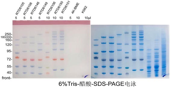 Tris-醋酸-SDS-PAGE凝膠電泳適合于分離高分子量蛋白,可以有效分離50-500 kD范圍內蛋白;電泳體系呈中性,能有效提高蛋白的穩定性;電泳緩沖體系中加入抗氧化劑,整個電泳過程都在還原條件下進行,有效防止二硫鍵的形成。