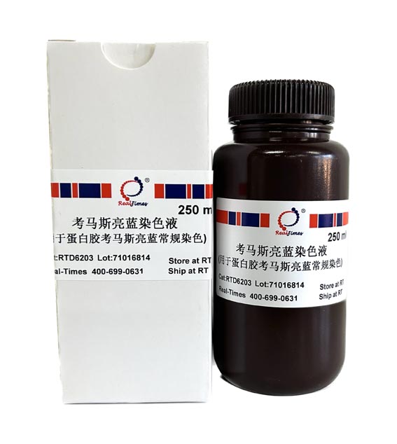 考馬斯亮藍(lán)染色液(Commassie Blue Staining Solution)是以考馬斯亮藍(lán)G-250為主要成分,采用新配方配置而成。可用于SDS-PAGE或非變性PAGE膠(native