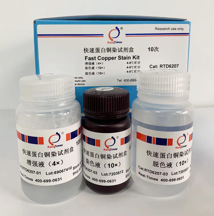 本試劑采用以銅離子為基礎(chǔ)的負(fù)染色方法,用于SDS-PAGE或Native-PAGE電泳凝膠染色,不需要使用含有刺激性的甲醛和冰醋酸,實驗方便快速,可以在30 min左右完成,最低能夠檢測出2 ng的蛋白條帶,該方法不對蛋白質(zhì)產(chǎn)生修飾作用,而且經(jīng)過脫色液處理后,可以用于電洗脫或采用PAGE膠蛋白微量回收試劑盒(貨號:RTD8108)進行膠回收,以便進行質(zhì)譜和測序分析等,也可以用其他染色方法(銀染或考染)對膠重新染色。