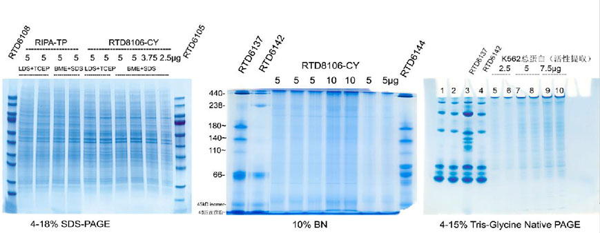 使用該產品提取的蛋白可以用于普通非變性電泳(Laemmli系統)(貨號:RTD6130,RTD6135)或Blue