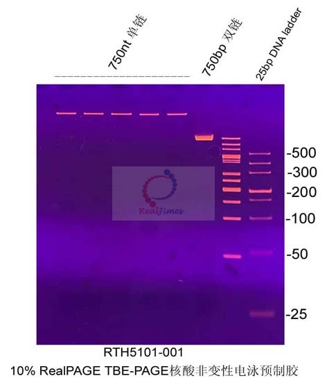 1.2 TBE- PAGE非變性電泳雙鏈DNA Marker可以選擇10 bp DNA ladder(10-100 bp)(貨號:RTM443)或20 bp DNA ladder(20-500 bp)(貨號:RTM441)或25 bp DNA ladder(25-500bp)(貨號:RTM444)作為分子量標(biāo)準(zhǔn);單鏈DNA Marker可以選擇單鏈DNA Marker(20-75 nt)非預(yù)混型(貨號:RTM507)或單鏈DNA Marker(10-75 nt)非預(yù)混型(貨號:RTM509)。