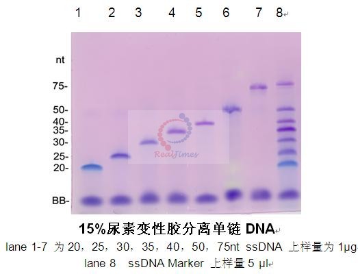 單鏈DNA Marker由不同長度的單鏈DNA分子混合而成,7條帶的大小為20,25,30,35,40,
