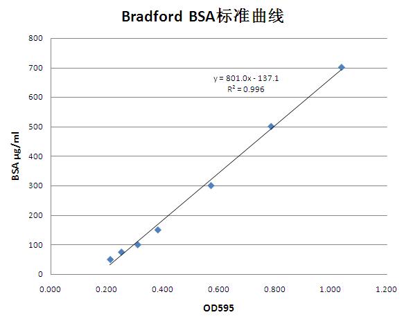 7.  以BSA含量為縱坐標A595讀數為橫坐標,繪制標準曲線,計算樣品中的蛋白濃度。如果所得到的蛋白濃度不在標準曲線范圍內,請稀釋樣品后重新測定。