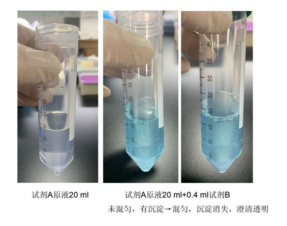 如,取50ml 試劑A1ml試劑B混合,配成51 ml BCA工作液。兩者混合時會有沉淀形成,徹底混勻后沉淀消失,溶液應為澄清淡藍色溶液。