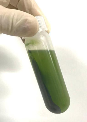 1.5.2 4℃ 1100 g離心15分鐘,小心棄上清,沉淀含葉綠體,呈深綠色(右圖)。