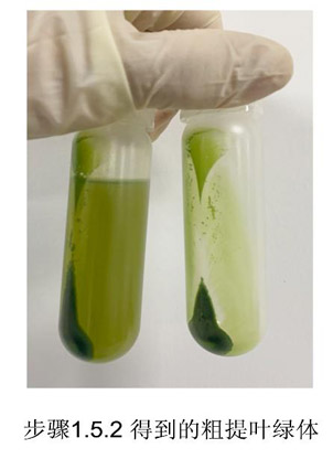 1.6.2.4 4℃ 3200 g離心15分鐘,上層綠色帶含破碎的葉綠體、線粒體和核糖體等,重液和輕液間的綠色帶為完整葉綠體(右圖)。