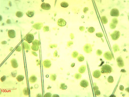 30克綠蘿葉片,加入150 ml 1×葉綠體提取緩沖液(即用型)勻漿5×10秒,3次過濾共收集120 ml過濾液,平分4管,4℃ 1100 g 離心15 min,棄上清,每管重懸于1.5 ml 1×葉綠體提取緩沖液(即用型)中,共得到6 ml 葉綠體粗提液。2×3 ml 粗提液平鋪于2×5 ml 40%密度梯度液之上,4℃ 3200 g離心15分鐘,棄上清,每管沉淀重懸于1 ml 葉綠體重懸液中,共得到2 ml精制葉綠體重懸液,測定葉綠素含量為3.43 mg/ml重懸液。30克葉片提取得到6.86 mg葉綠體。取10 μl葉綠體溶液稀釋20倍,取50 μl稀釋液顯微鏡40倍物鏡觀察,如右圖。