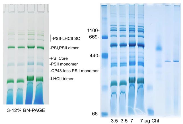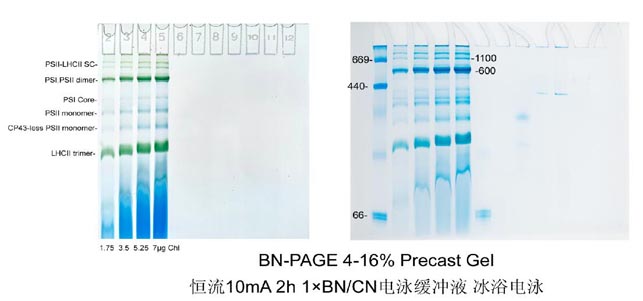 1.9.3 取上清移至新管中(大約可以取到45 μl上清),加入1/10體積的類囊體膜上樣緩沖液,BN-PAGE 3-12%或4-16%梯度膠電泳(貨號:RTD6139-0312或RTD6139-0416),上樣體積5-15 μl。