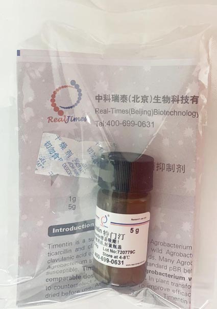 Potassium),按有效酸計,替卡西林鈉與克拉維酸鉀的配比為15:1,替卡西林是青霉素類殺菌試劑,而克拉維酸則是一種不可逆性高效β-內酰胺酶抑制劑。多種革蘭氏陽性菌(G+)和陰性菌(G-)都能產生β-內酰胺酶,這類酶能在青霉素作用于病原體之前將其破壞。克拉維酸通過阻斷β-內酰胺酶破壞細菌的防御屏障,恢復替卡西林敏感性。克拉維酸鉀單獨抗菌作用甚微,但與替卡西林配置后使本品成為具有廣譜殺菌作用的抗生素,適用于對廣泛的細菌感染性疾病的經驗治療。在科研中常用于抑制農桿菌生長,特別在胚性愈傷組織再生系統中,能達到很好的抑菌和再生效果。
